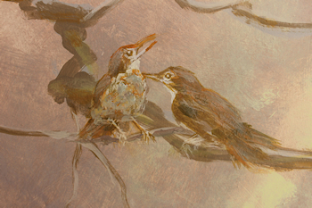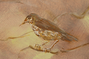 This has served as my head dressing for, well, longer than I'd like to admit. My hair has a permanent ridge over the top of my head. Let's just say that I could have received a degree in the amount of time it's taken me to complete this audiobook. The actual performance of it came relatively easily, even though it had been decades since my last bonifide acting job. (My formal training was in the theatre. It wasn't until much later that I sought formal visual art training.) No, the time it took to complete the finished recording of "The Topsail Trek" (authored by JT Kalnay) was due to my lack of training in audio engineering. I needed to LEARN IT ALL before uttering a single word into the microphone. Could I do it? I knew I wanted to. I knew I needed to. But it would take time, perseverance and patience. The problem for me was that there was no tutor, no human being to answer my questions as I went along - only the internet (forums, youTube pros, advice sites) and phone calls and emails to audio equipment retail salespersons and manufacturer reps. I went through 3 microphones, 2 interfaces (the hardware that converts analog to digital) and test drove at least a half dozen DAWs (Digital Audio Workstations - the recording and editing software). I added other hardware (a preamp and gain booster) to my recording chain along the way as well. Tested each, trying to remove whatever new noise each piece was adding to my signal, trying to determine if it was worth the new noise. All of those impediments (including, of course, my internal natural mouth noise while speaking closely into the mic) had to be removed with my software - which, in itself, required much study, testing and implementation. After all of that, right about Chapter 100 (this book has 125 chapters) I think I got it all to work nominally well. Once I was able to click the "I'M DONE" button on my upload page on the ACX site, I felt as if I'd given birth to a 400-pound gorilla. As with all baby gorillas, they're lovable and cuddly, but still kind of primative. And so it goes with this mammoth undertaking. It's been intense. I have lived through many things in the course of this endeavor (not the least of which was cancer treatments), but it was worth it if for no other reason than to simply see it through. The final product is far from perfect, but I know I gave it my best. I know I still have much to do to improve my recordings, but at some point, I feel as though I'll be able to somewhat confidently add this to my skillset as an artist, mixed in with my painting, writing and everything else. I want to use it all while it's still there and I'm still here. As corny as it sounds, I do feel a certain healthy glow having pursued something new and challenging and coming out the other side relatively unscathed. Speaking of survival, and if I haven't worn out my welcome, there's a little more about how this diversion toyed with my soft underbelly in the NOTIONS section =========> OCT 25, 2018: My idea for the panel images was to have them blend into the environment - something familiar from nature, something specific to this place. From earliest spring to mid summer, the haunting mating song of the male wood thrush wafts through the trees on any given day. When the bird is close by, the subtleties and complexities of that song are so engaging that it stops me in my tracks to listen. I was so inspired by it, years ago I carved its likeness into three print blocks, not yet knowing where I'd use them, if ever. ![]() ![]() Not wanting to spend a bunch of time on this project, I remembered those print blocks and decided to use them here. I wanted the panels to be sort of stylized anyway, so I thought this would be a perfect use for them. What I learned, though, was that using acrylic paint for the print block medium just plain doesn't work right (you're supposed to use ink or screen printing paint). <![]() The acrylic paint tends to pull back onto the print block when it's removed, leaving a sort of bead effect. If I'd used less water in the mixture, it might have worked better, but in the end, it gave it kind of an interesting ethereal effect that seemed appropriate in this case (wood thrushes are normally heard and not seen). At least that's how I justified it. The two south window panels turned out quite a bit different than the first, which was okay since they wouldn't be seen from the same plane from the outside. I worked on both of them at the same time, setting up two easels side by side. ![]() <-------------------------------------------------- 56.5" --------------------------------------------------> Since the branches turned out a bit less stylized, I decided to be a little more representational with the birds - first stamping their images with the print blocks for guidance, then painting them in. ![]() ![]() Pulling colors from the background onto the birds was my attempt to blend them into the scene. I think it worked to some degree. The foam core itself was not dense enough to fully block out light, so I put a couple of layers of gesso on them first. Unfortunately, since gesso is a size as well as a ground, the first panel severely cupped after drying. I had to put weights on the back for a couple of days, which helped a bit, but didn't quite do the trick, so I gessoed the back side and it corrected the bow well enough. I decided to try to use this idea on the other two panels by putting a coat of gesso on each side right off the bat. It worked beautifully - the size on each side counteracted the other, leaving the board perfectly flat. In case I didn't mention it before, the images are seen from the outside. After first inserting them into the windows, I went outside to see how they looked. What I didn't count on was the fact that the windows have a UV protectant in the glass. This isn't visible from the inside, but, looking from the outside in, anything behind those windows is darkened. My panels were barely visible! What's kind